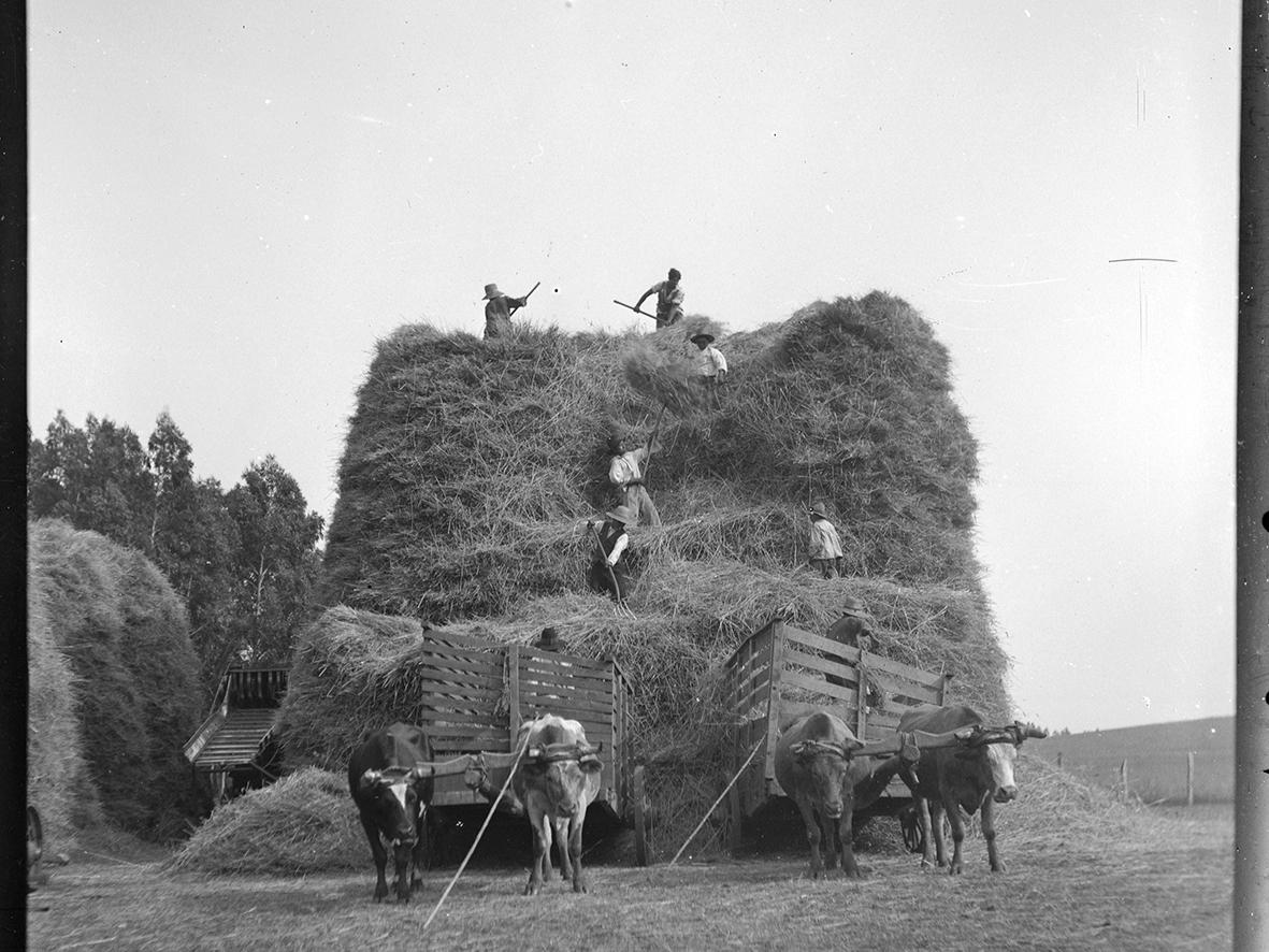 Benedicto Rivas Núñez. Torre de trigo en trilla en Los Carrizos. Cholchol, c. 1930. Negativo en placa de vidrio. Colección Benedicto Rivas, Archivo Fotográfico y Audiovisual de la Biblioteca Nacional. N.º inv. CLBNAF_C0029_S01_PLB0016.