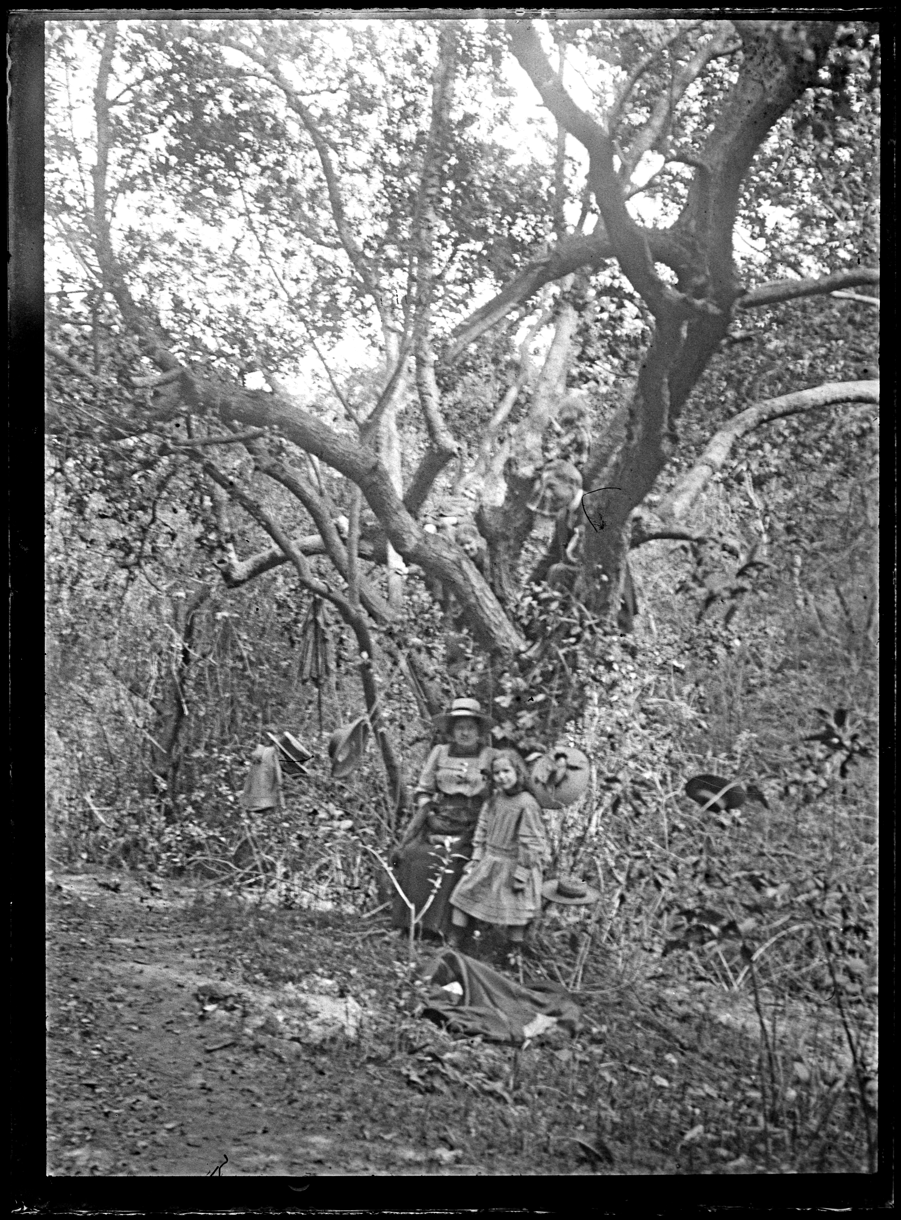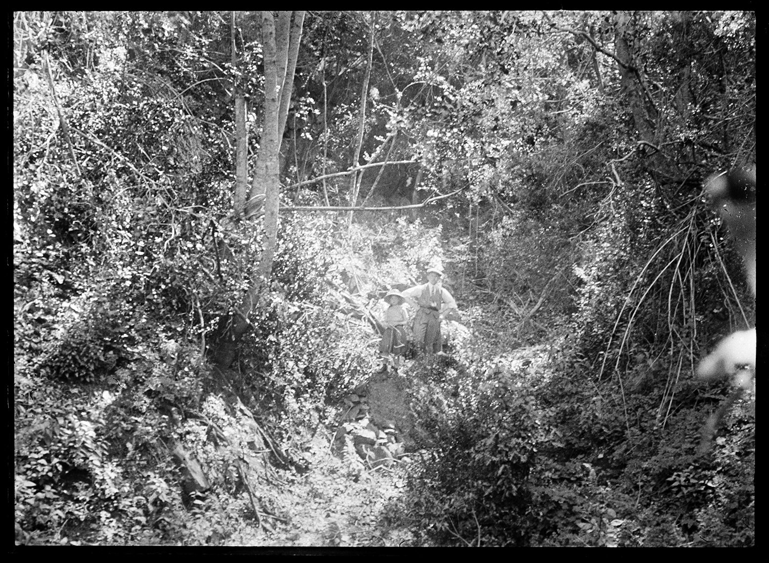 Teodoro Kuhlmann. Un Hombre, una mujer y una niña en la naturaleza. Región de Valparaíso, 1900-1950. Placa negativa de vidrio blanco y negro. 4,4 x 5,9 cm. Colección Teodoro Kuhlmann Steffens, Museo Historia Natural de Valparaíso. N.º inv. MHNV-TKS-0243.